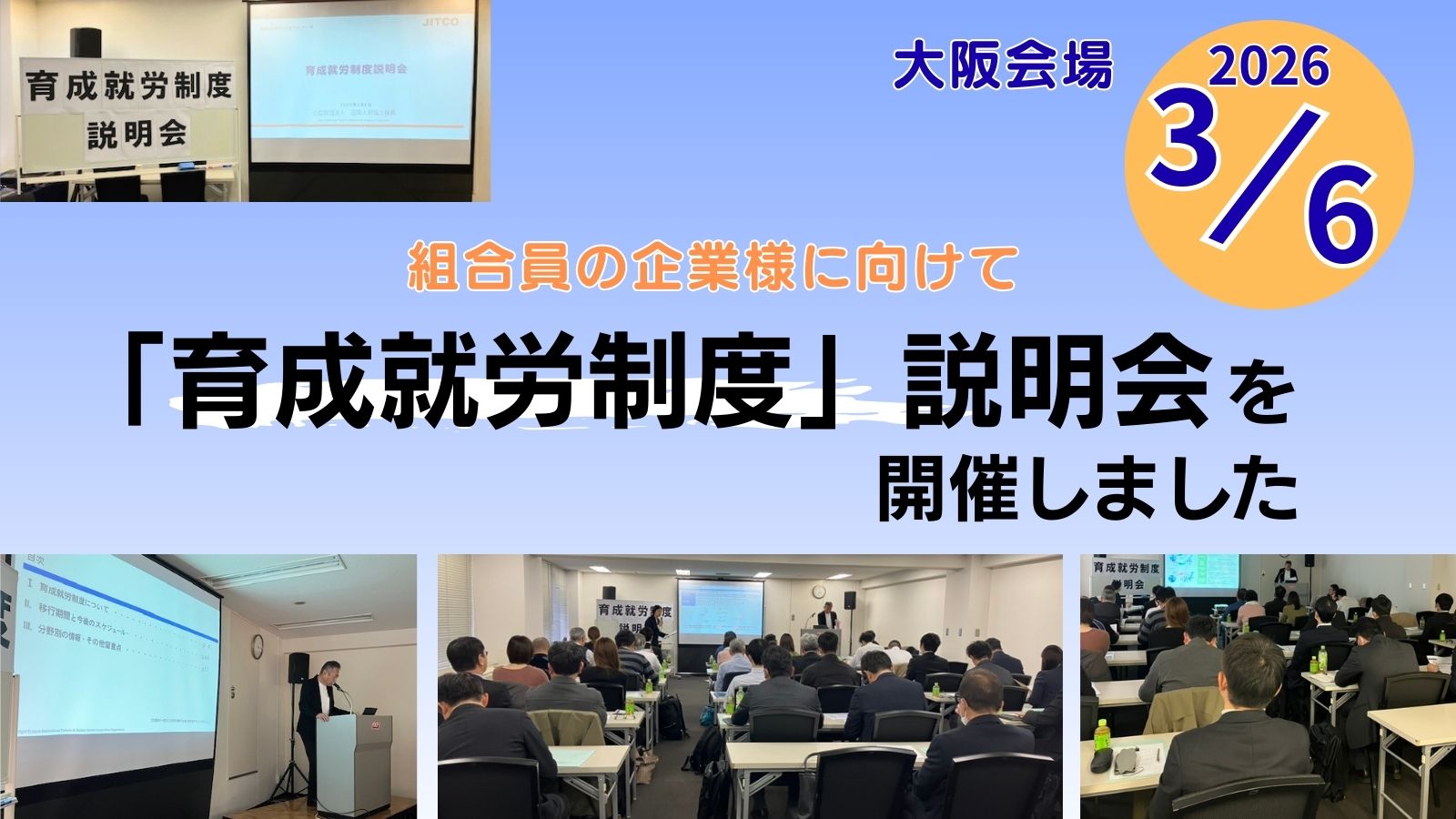 2026年3月6日(金)に組合員の企業様に向けて、育成就労制度に関する説明会を 開催しました。大阪の会場に近畿圏の企業…